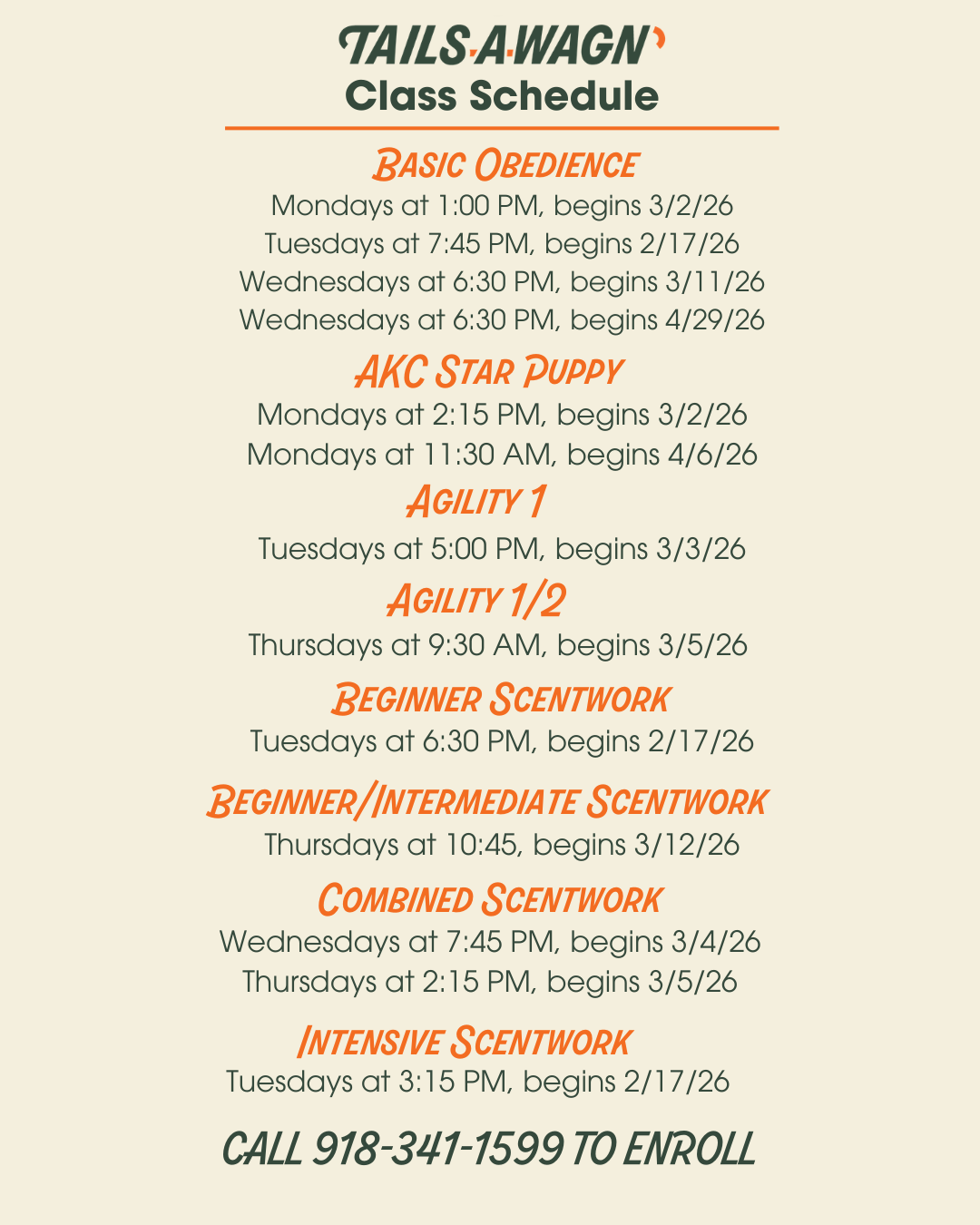 Our Tails-A-Wagn’ training team is equipped and ready to provide you with the tools and information you need to have a well-mannered dog that lives in harmony with your family. With 40+ years of combined experience in canine behavior and training, our team works with you to set foundational skills through positive, consistent, and reward-based techniques. We offer classes in obedience, scentwork, and agility, all varying in skill-level to best cater to your needs.